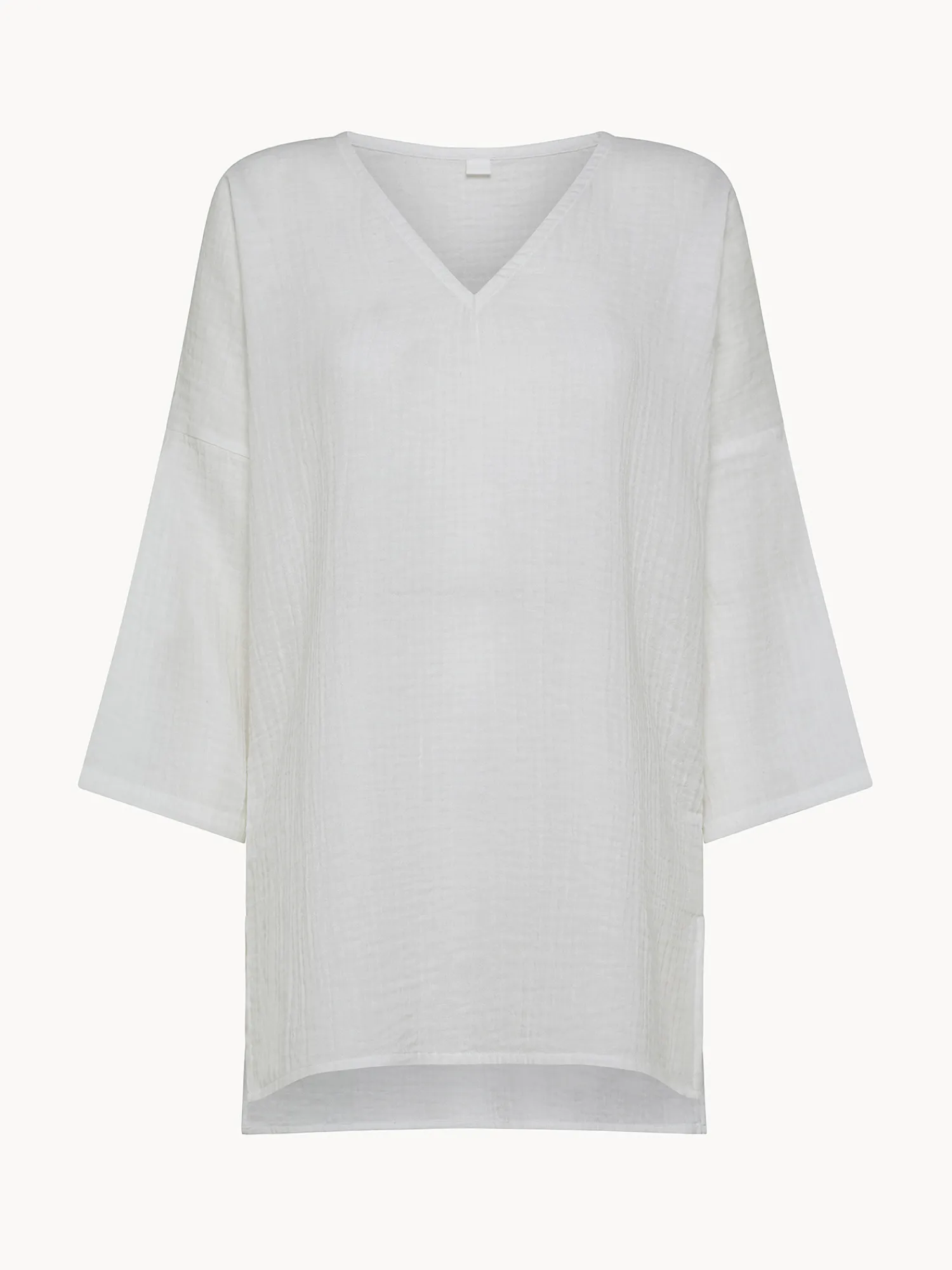 - Caftano bianco tinta unita in morbida mussola di cotone, con scollo a V e maniche a 3/4