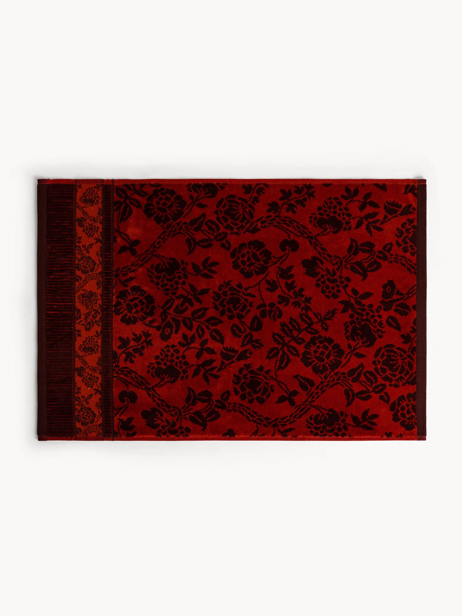 - Asciugamano ospite tinto in puro cotone velour tinto in filo con fantasia floreale.
