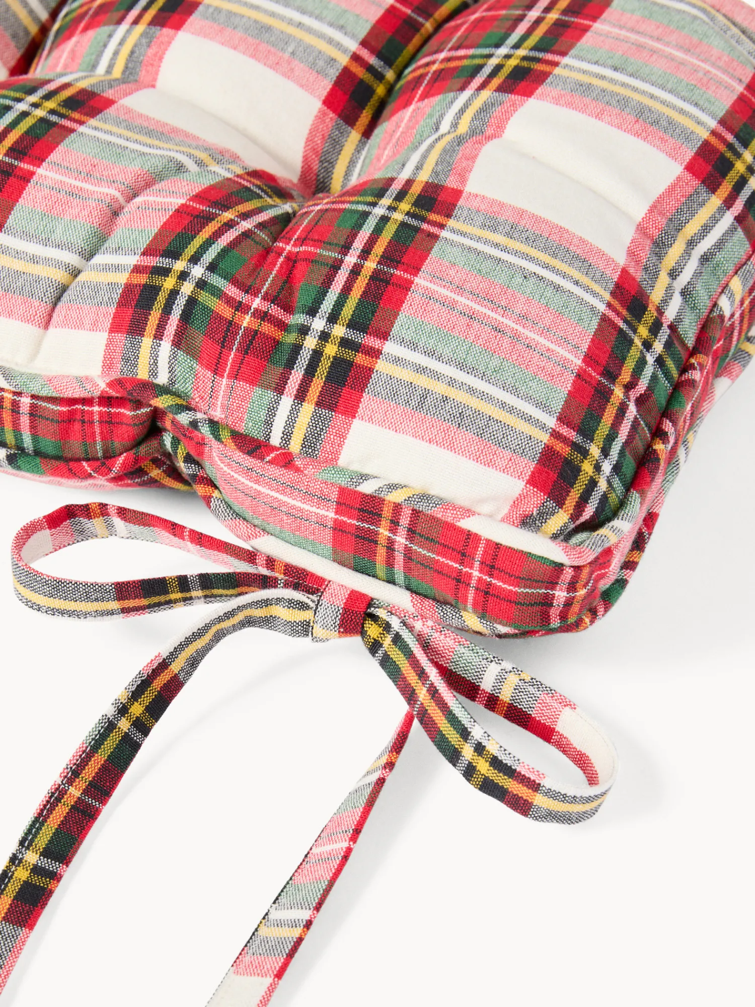 - Cuscino sedia tartan a materasso con lacci in puro cotone tinto filo. Perfetto per regalare comfort e un tocco caldo e accogliente, evocando la magia del Natale e creando un’atmosfera conviviale e festosa.