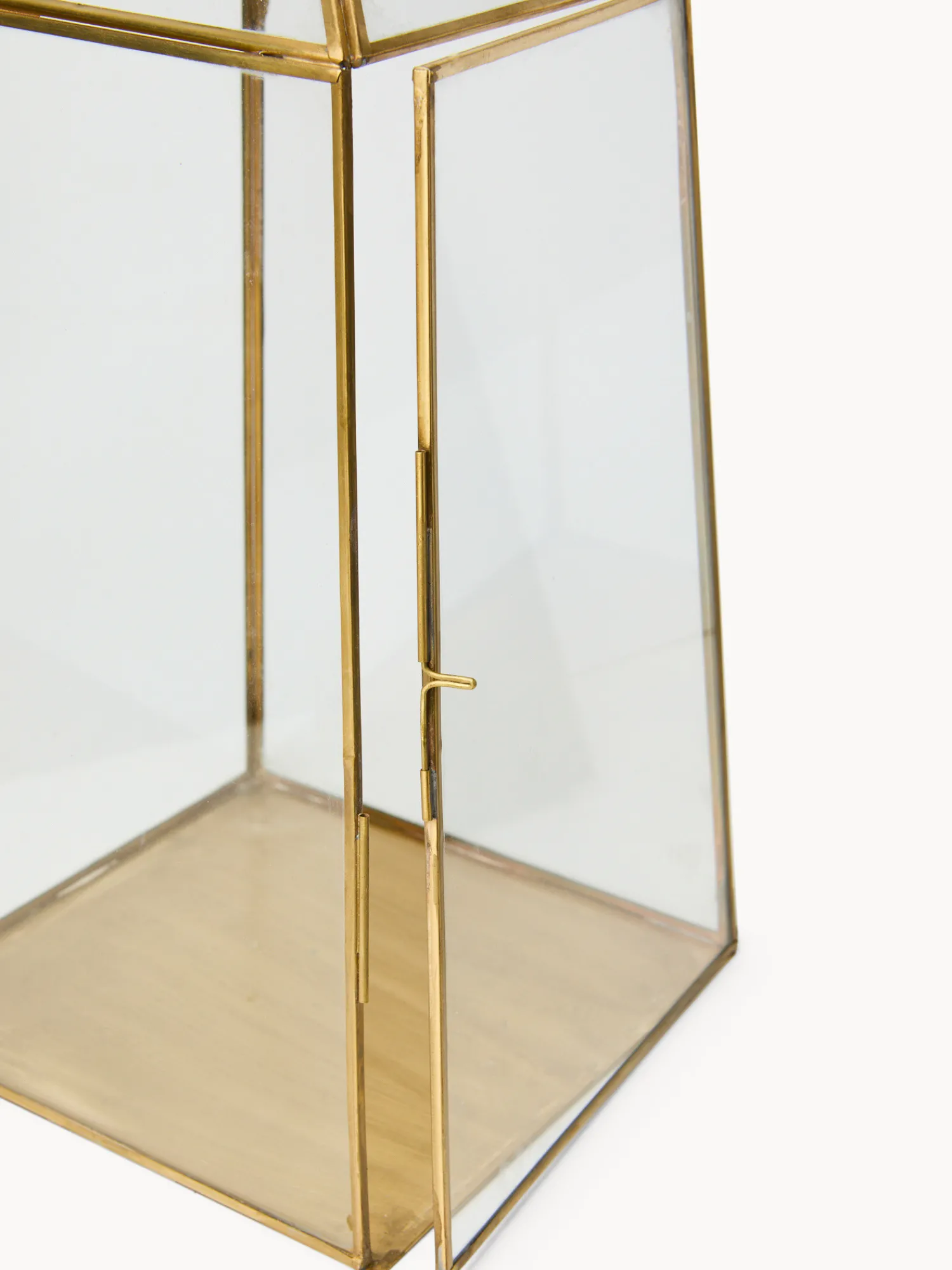 - Lanterna in vetro con base, profili e gancio in ottone con finitura dorata