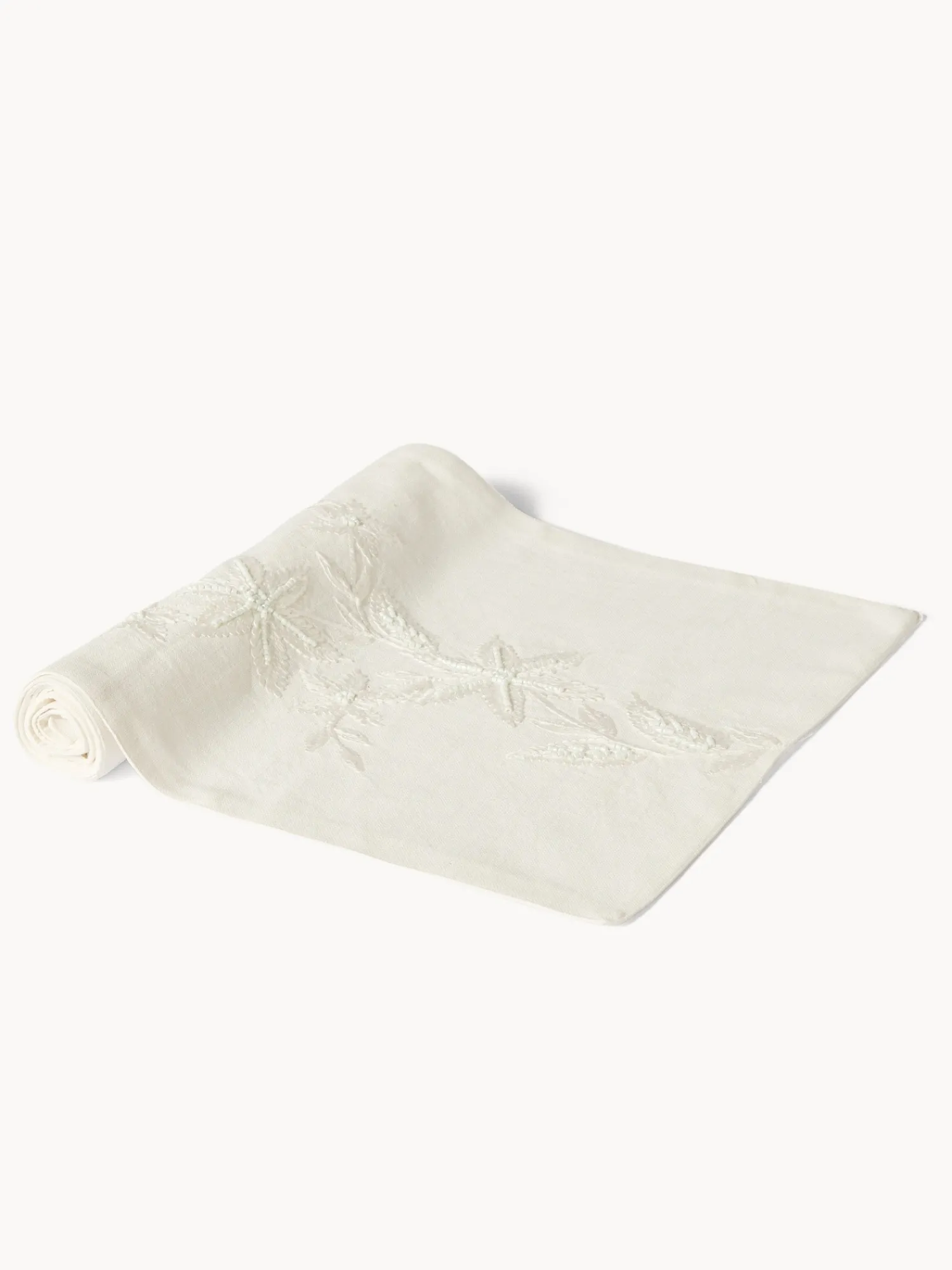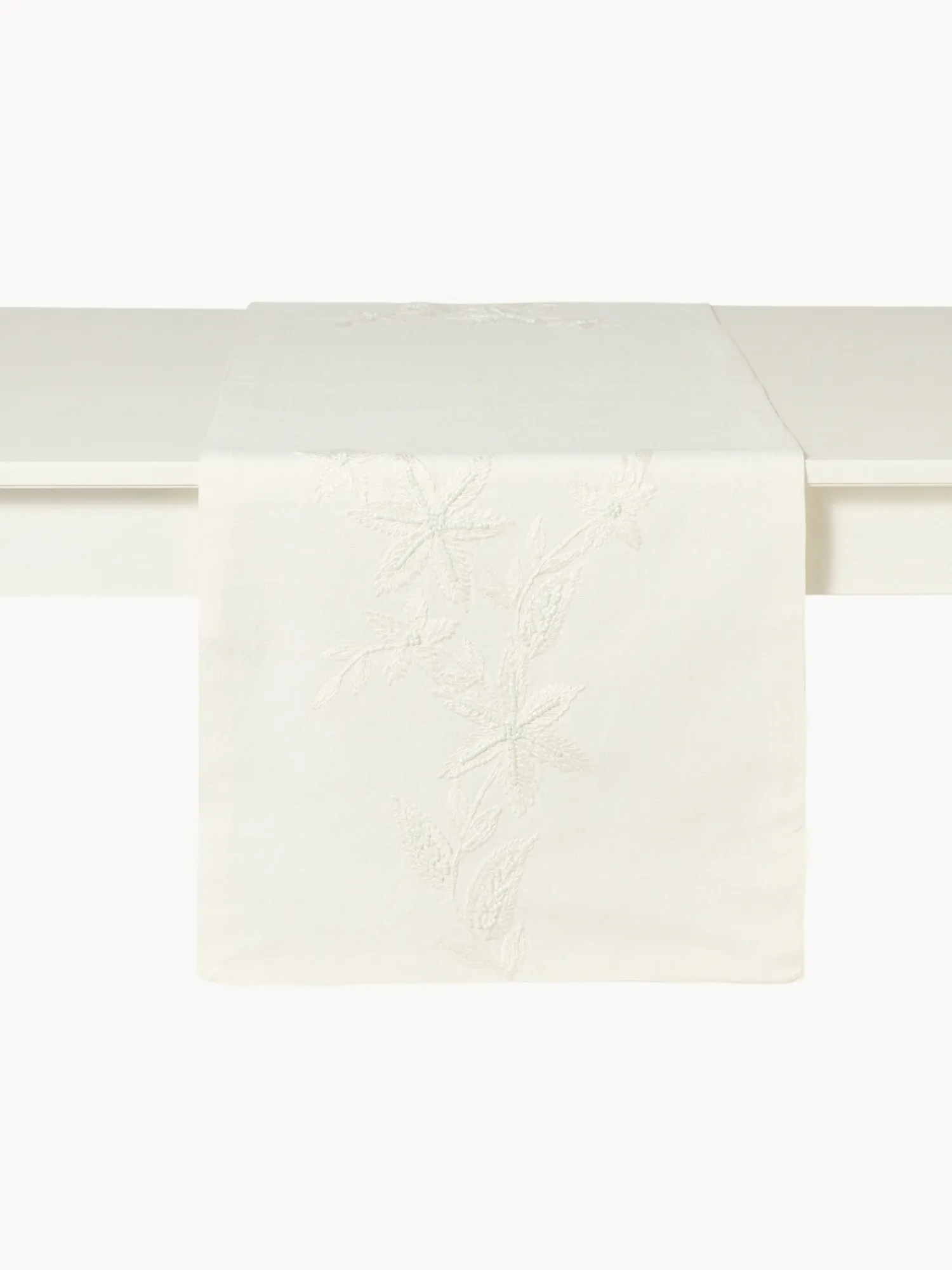 - Runner in puro cotone con ricamo floreale. Il runner è in puro cotone con un delicato ricamo floreale impreziosito da perline, che regalano dettagli unici alla tavola.