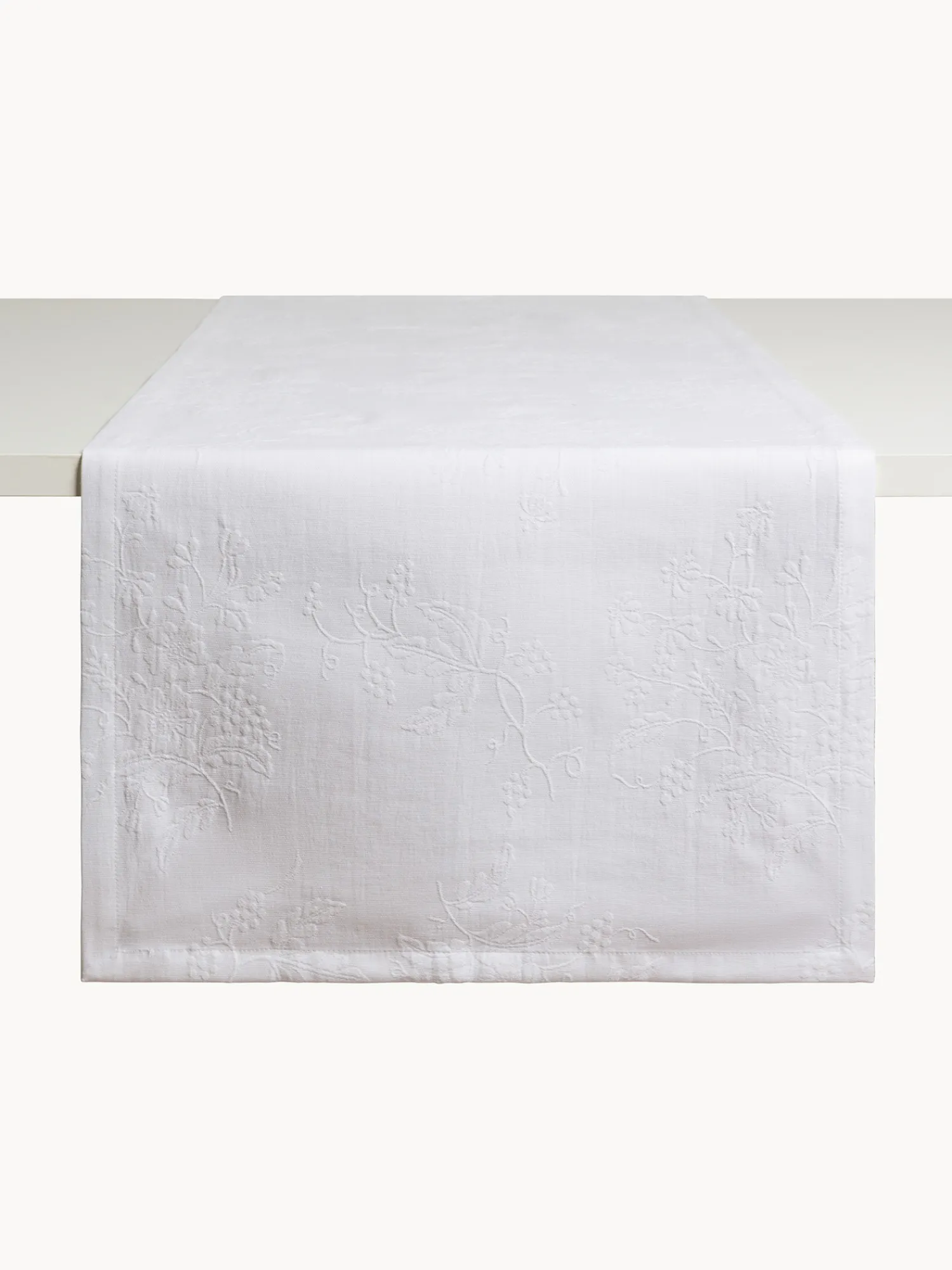 - Runner in puro cotone jacquard con delicato motivo floreale, che unisce eleganza minimalista e romanticismo discreto. Realizzato in Portogallo, questo runner aggiunge un tocco raffinato e sofisticato alla tavola, trasformando ogni pranzo o cena in un’esperienza di stile e classe senza tempo.