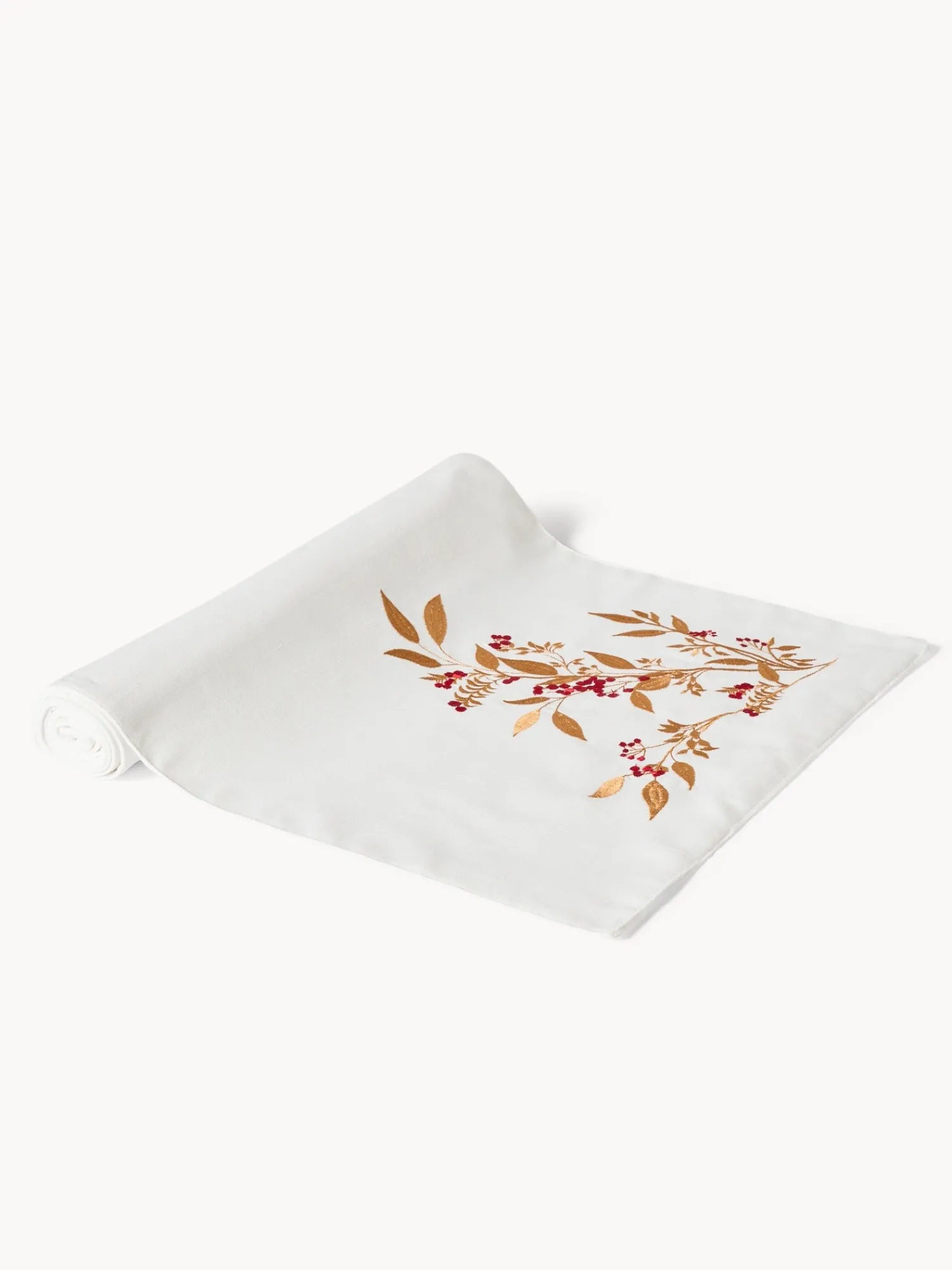 - Runner in slub di puro cotone con ricamo foliage. Il runner è in slub di puro cotone con un elegante e delicato ricamo di foliage e bacche in bronzo.