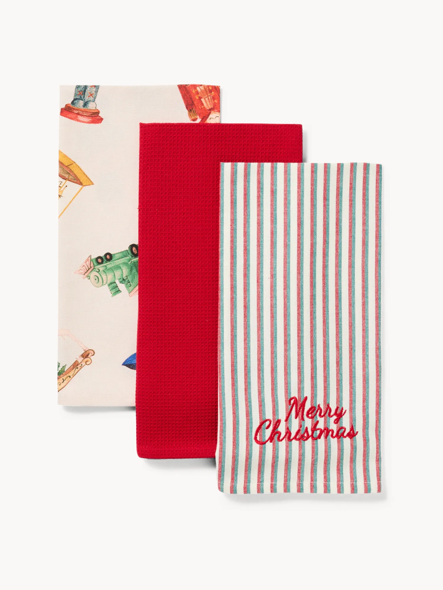 - Scatola regalo con set di 3 strofinacci. Un’idea regalo simpatica e originale, perfetta per sorprendere i nostri cari e amici o per concederci un piccolo momento di coccola durante le festività natalizie. La scatola a forma di casetta è in carta, e al suo interno racchiude tre strofinacci in puro cotone: uno stampato, che riprende la stessa fantasia della scatola, uno in tinto filo con motivo a righe e con ricamo “Merry Christmas”, uno tinta unita con trama a nido d’ape.
