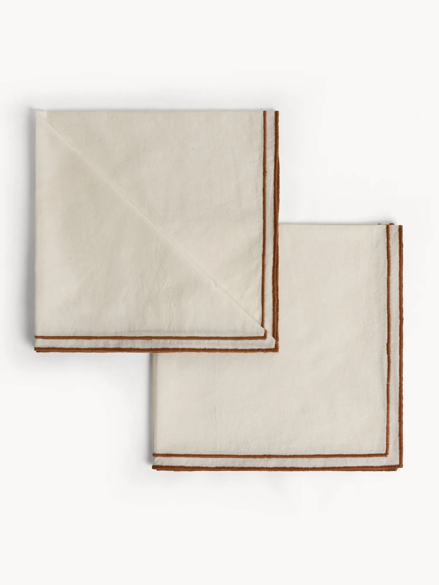 - Set di 2 tovaglioli in puro cotone, impreziositi da un raffinato doppio overlock a contrasto che dona un tocco di stile alla tavola. Morbidi, resistenti e facili da abbinare, sono l’accessorio ideale per completare con eleganza ogni mise en place, dal pranzo quotidiano alle occasioni speciali.