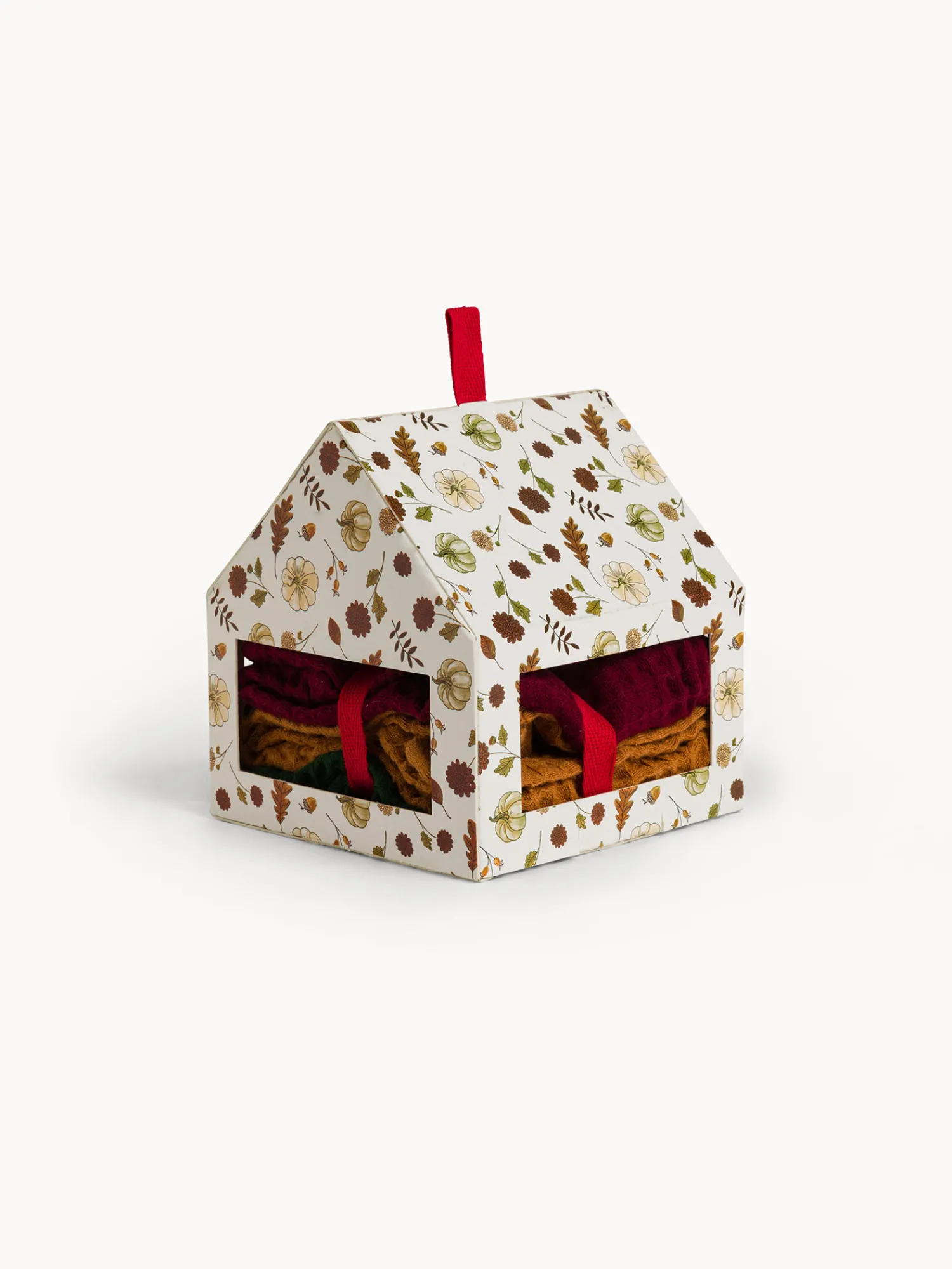 - Set di 3 strofinacci in puro cotone con elegante trama a nido d’ape, pensati per un’asciugatura rapida e funzionale. Presentati nella simpatica “casetta autunnale” che li contiene, diventano anche un’idea regalo originale e raffinata, perfetta per chi ama unire praticità e stile nella cucina di stagione.