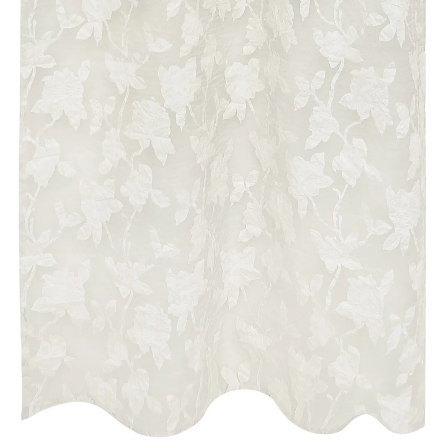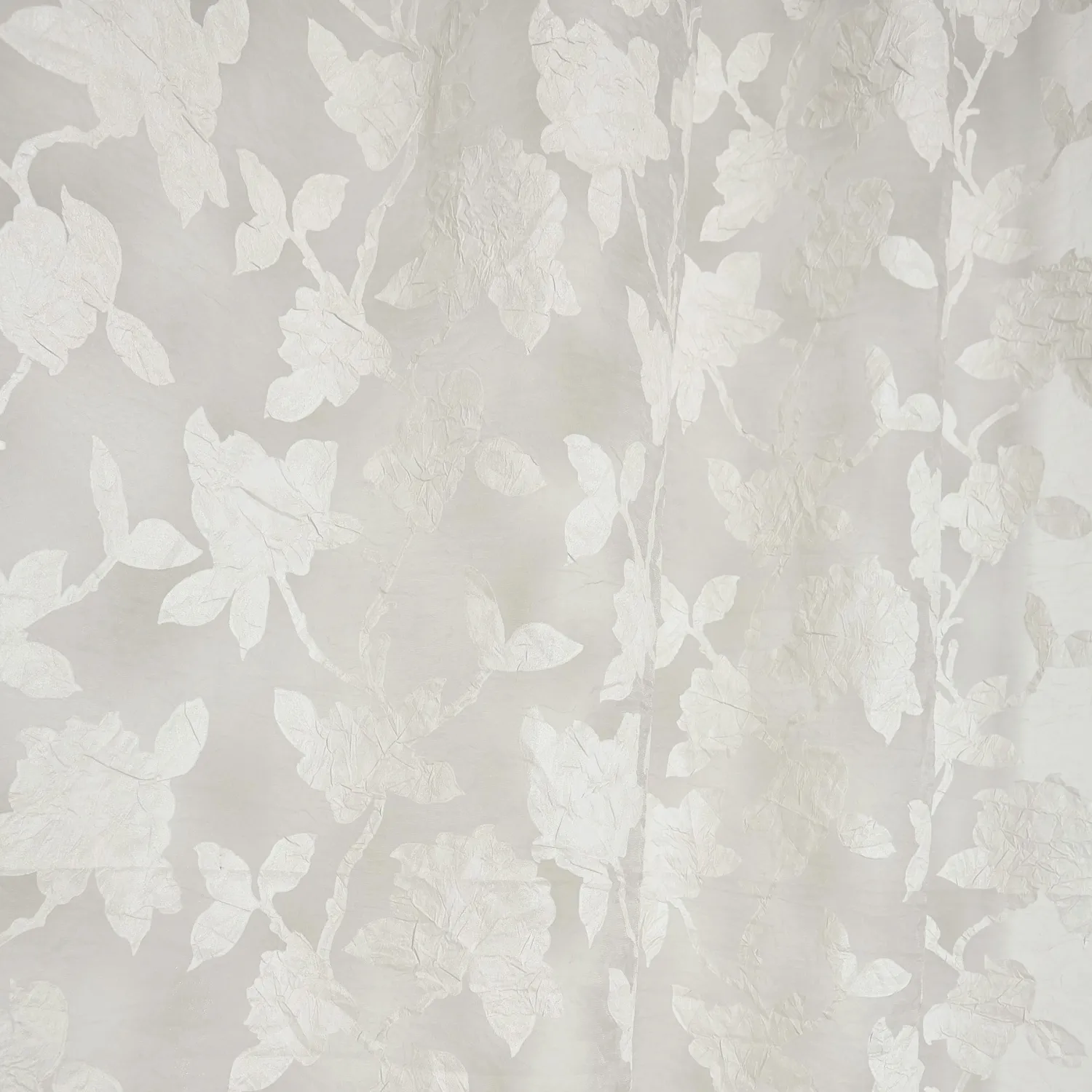 - Tenda con decorazione rose ottenuta tramite stampa devore. La particolare tecnica di lavorazione consiste nell’applicare in stampa una sostanza “devorante” che brucia parte del materiale per far emergere un disegno. Passanti nascosti e possibilità di appendere con riloga.