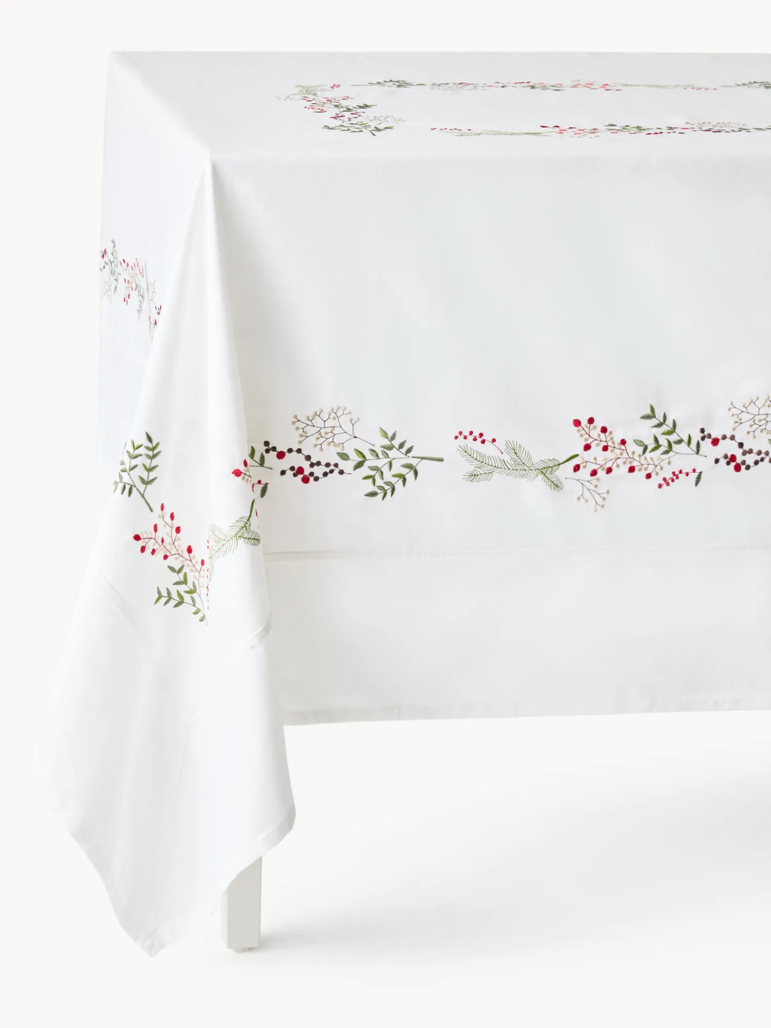 - Tovaglia in puro twill di cotone con doppio ricamo piazzato agrifoglio.Elegante e raffinata, porta un tocco di magia e calore festivo alla tavola, trasformando ogni pasto in un momento speciale.