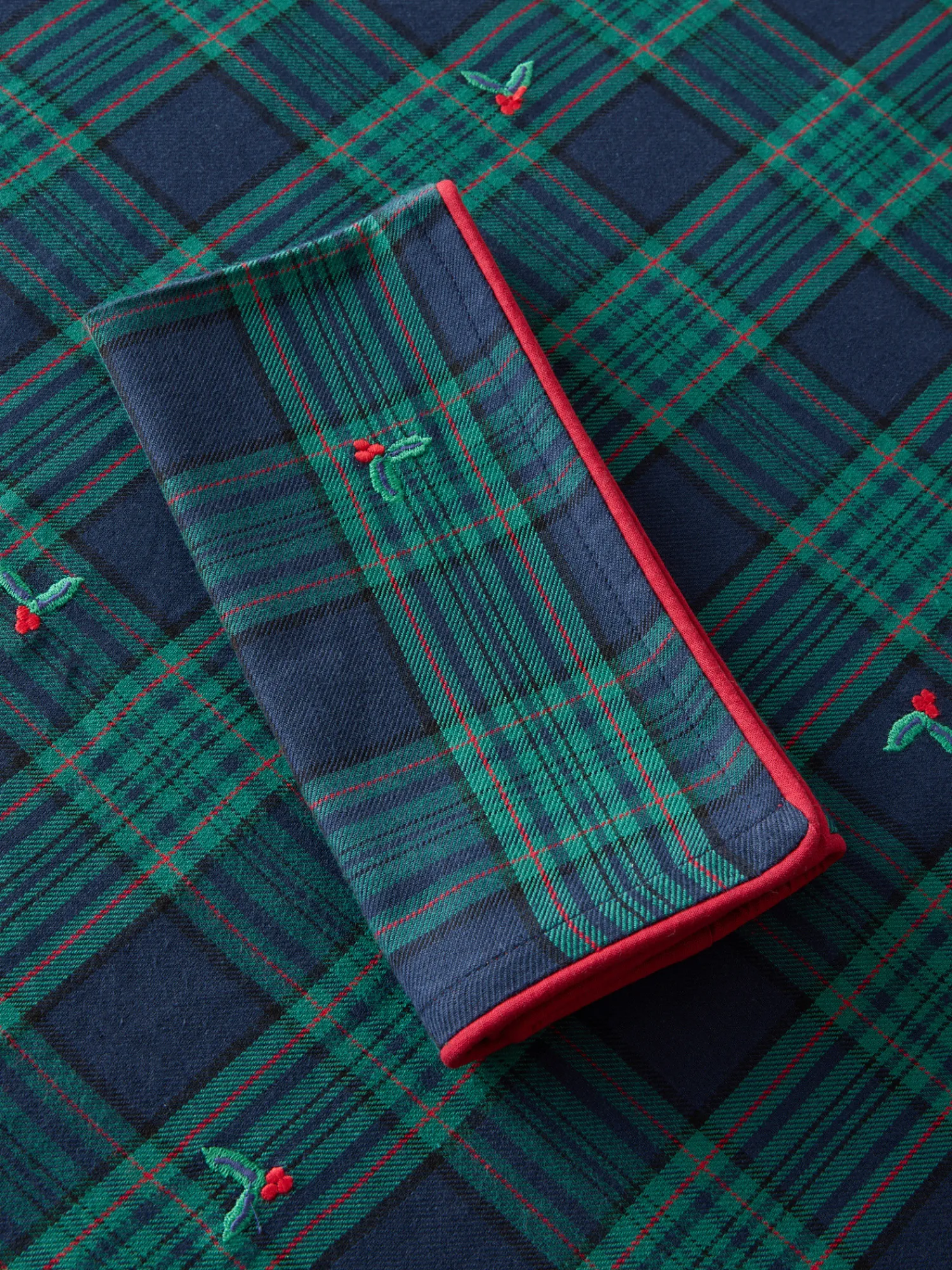 - Tovaglia tartan in twill di cotone con ricami agrifoglio. La tovaglia è in twill di cotone tinto filo motivo tartan con ricami agrifoglio e overlock a contrasto. Perfetta per portare l’atmosfera calorosa e confortevole delle feste in tavola.