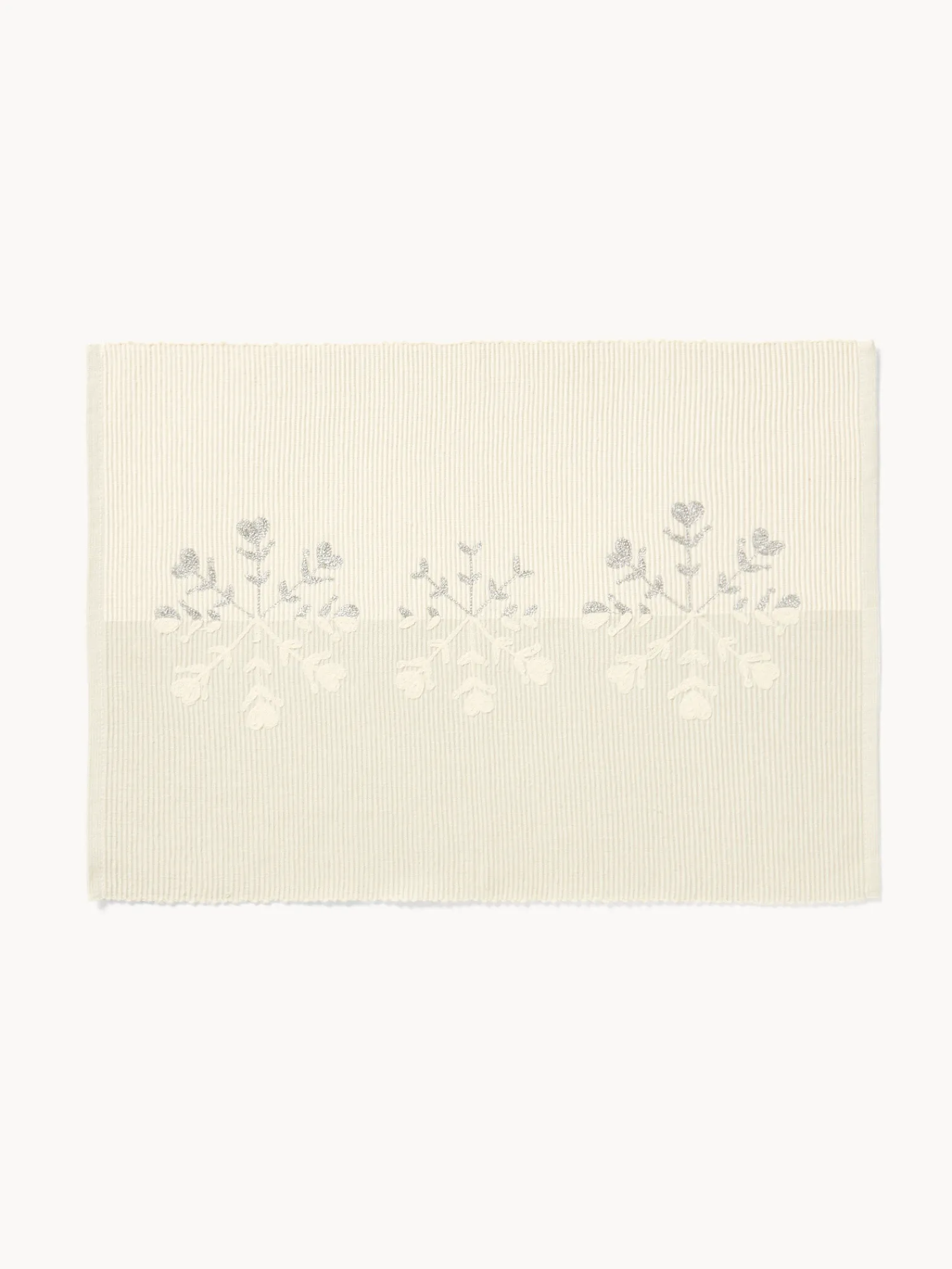 - Tovaglietta in puro cotone a costine. La tovaglietta è in puro cotone con una struttura a costine, che le consente di essere piegata o arrotolata facilmente. Sono ricamati con fili argentei in lurex dei graziosi fiocchi di neve, per celebrare la magia dell’inverno anche a tavola.